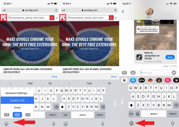 试着用一个拇指打字?默认的iOS键盘提供向左或向右的选项。将手指放在键盘底部的地球仪或表情符号图标上(如果你安装了三个或更多键盘,它将显示地球仪),在弹出的窗口中,你将看到一个左右键盘选项。点击您的首选项。点击指向您的首选项对面的箭头以返回到全屏。(这只在纵向模式下有效,如果你在设置>显示和亮度下调整到“较大文本”视图,则不起作用。)