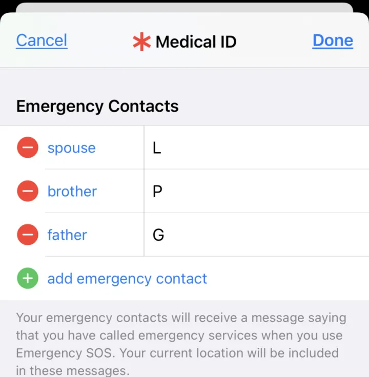 确保你最重要的人都在你的联系人中。然后转到健康,点击你面部的图标,然后医疗ID>编辑>紧急联系人,指定一个或多个紧急求救人员(S),如果你有问题。(SOS还会联系紧急服务机构。)现在,在您的联系人列表中,它们的旁边会显示一个红色星号。