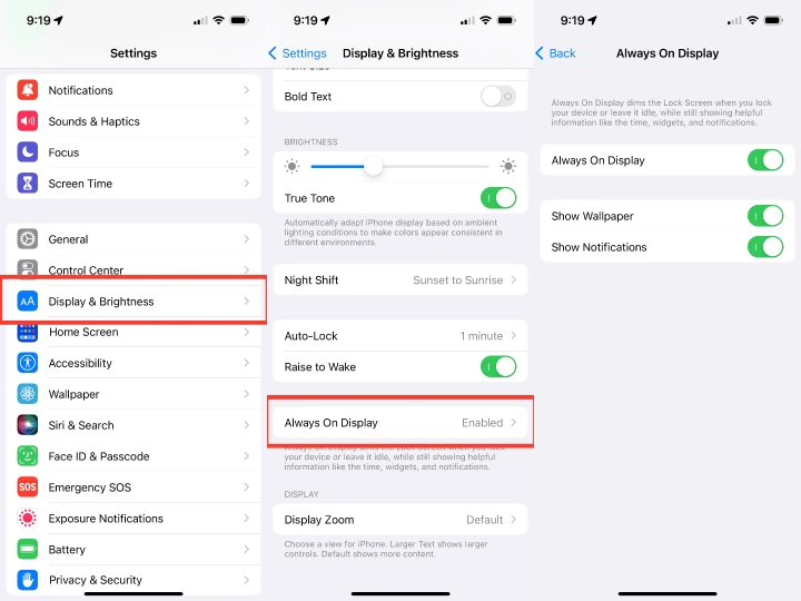 如果你不喜欢iPhone的始终开机显示,你可以很容易地把它关掉。打开设置>显示和亮度>始终打开显示并关闭始终打开显示选项。这将禁用该功能,并确保您的电话屏幕一如既往地关闭。