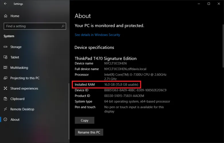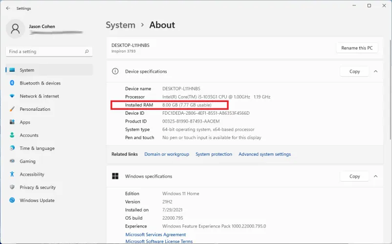 无论你是仍然使用Windows 10,还是已经升级到Windows 11,检查你的内存都很容易。打开“设置”>“系统”>“关于”,然后移动到“设备规格”部分。您应该会看到名为“Installed RAM”的行,它将能够告诉您当前有多少内存。