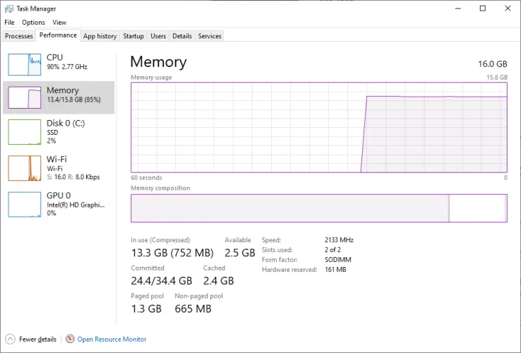 单击Performance选项卡并选择侧边栏中的Memory,以查看当前RAM使用情况的图表。你不希望图表完全为空–毕竟,未使用的内存就是浪费的内存–但如果当你试图执行基本任务,如浏览网页或撰写文档时,内存完全满了,你可能就该升级了。