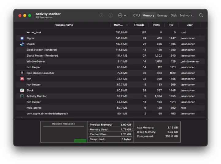 记住,更多的空闲内存并不等于更好–只要你有一些空闲的内存,你就很好,应该考虑其他潜在的升级。但是,如果活动监视器显示内存已满,则可能需要更多内存。在此期间,您可以检查进程列表并关闭任何使用大量内存的程序。