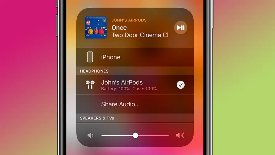 您还可以从控制中心共享音频。点击AirPlay图标,然后选择显示您的耳机的图形下方的共享音频按钮。将两个设备并排放置,并在屏幕上显示共享音频时点击共享音频。然后,您的朋友必须在他们的设备上点击加入才能完成连接。