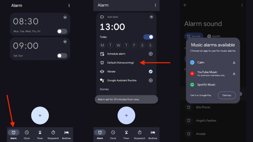 打开谷歌时钟>闹钟>加号(+)>声音(铃声图标)。从下载的曲目中进行选择,或者点击您的YouTube音乐、Spotify或Calm曲库获取更多选项。谷歌今年为Pixel设备更新了时钟应用程序,使其更容易录制和使用自己的声音作为闹钟和定时器。在设置中寻找新的录音选项;点击打开录音器应用程序,捕捉你选择的噪音。