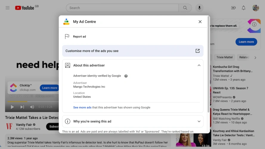 在YouTube视频的预滚动广告过程中,点击键盘上的Tab+Enter组合键,就会在“About This Ad”框中显示详细信息,说明你为什么会看到这则广告,以及广告背后的幕后黑手。从那里,你可以报道广告,或者至少要求以后不再看它。