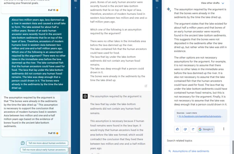 理论上,所有三个人工智能聊天机器人都可以根据这些数据进行训练。LSAC的页面确定了正确的答案:最后一个答案,Bing(没有引用)和Bard(令人惊讶的是,只有一个引用)都答对了。ChatGPT屏蔽了它。