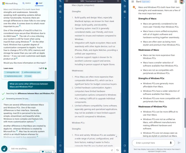 我们让这三个聊天机器人分析了Mac和Windows PC平台的优缺点。(下面的屏幕截图去掉了提示符,以便为答案留出更多空间。)我不喜欢必应的回应,但ChatGPT和Bard在这里都做得很好。ChatGPT的响应有点冗长,您可能喜欢也可能不喜欢。