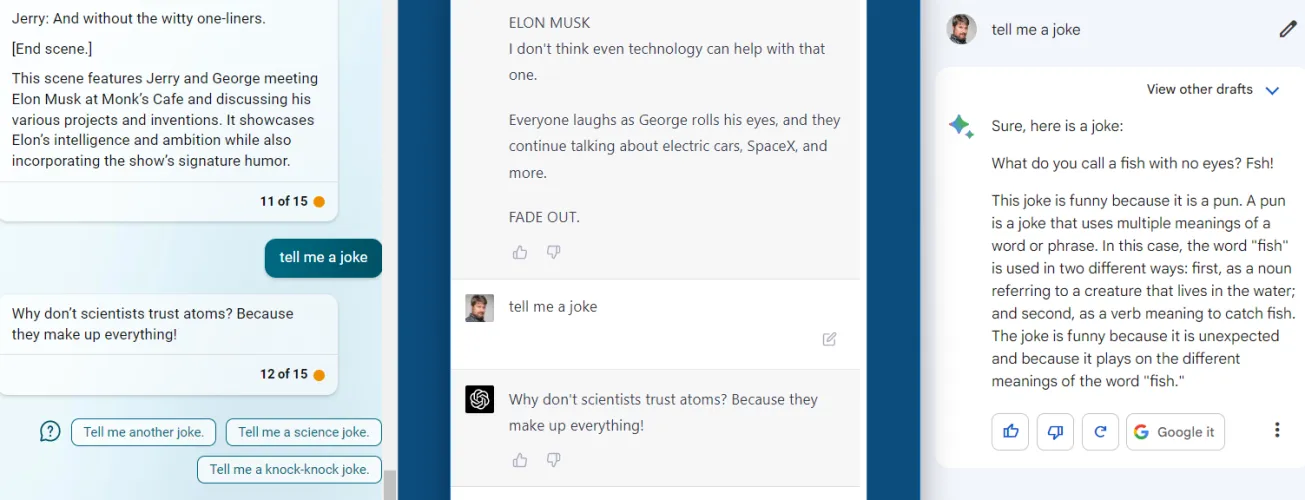 我们向所有三个人工智能提出了各种不同的问题:一些是关于一般搜索主题的扩展,一些是需要意见、逻辑谜题甚至代码的问题–然后要求他们更有创意,比如写一个替代的、更好的结局《权力的游戏》和一个有特殊嘉宾的宋飞场景。我们已经包括了他们的所有答案,或者我们所能提供的尽可能多的答案,我们将让您自己决定。