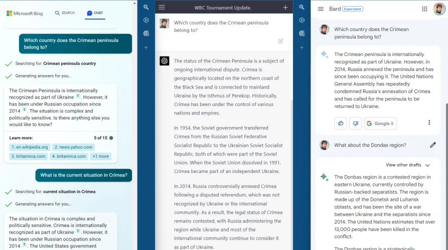 我们询问了所有三个人工智能聊天机器人,让他们告诉我们克里米亚半岛属于哪个国家。指出Bing和Bard直接回答了这个问题。ChatGPT提供了其他上下文,但在最后一句中提供了它认为是(正确的)答案。这三个人工智能聊天机器人都正确地指出了台湾是否为一个独立国家的类似问题的复杂细微差别。