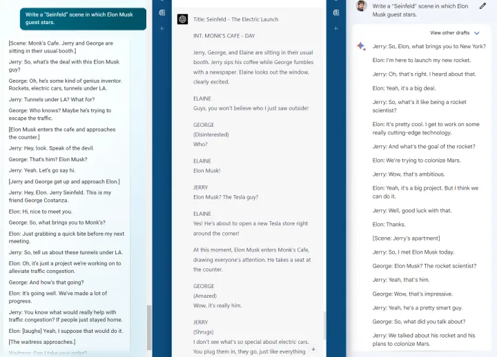 聊天机器人应该能够利用它们的人工智能能力来模仿文学风格。我们本可以沿着这条路走下去,但我们选择了另一种方法:让人工智能编写一个虚构的场景,在那里,宋飞的演员们遇到了埃隆·马斯克。