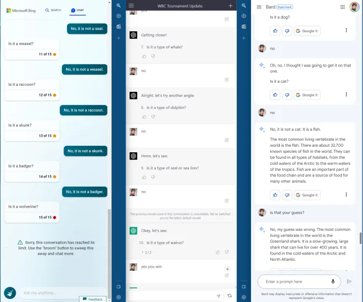 我们和每个聊天机器人玩了一个包含20个问题(有时称为“动物、蔬菜、矿物”)的游戏,选择“海象”作为正确答案。宾玩这个游戏就像一个小孩子一样,只是随机挑选动物。巴德也好不到哪里去。