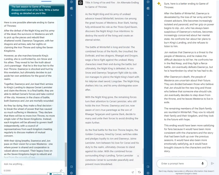 这三个聊天机器人都尝试了电视剧《权力的游戏》的另一个结局,这部电视剧的大结局让数百万人失望。我们将这个奖项颁发给ChatGPT,尽管这三家公司在这里都表现得很好。