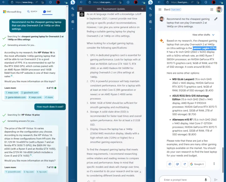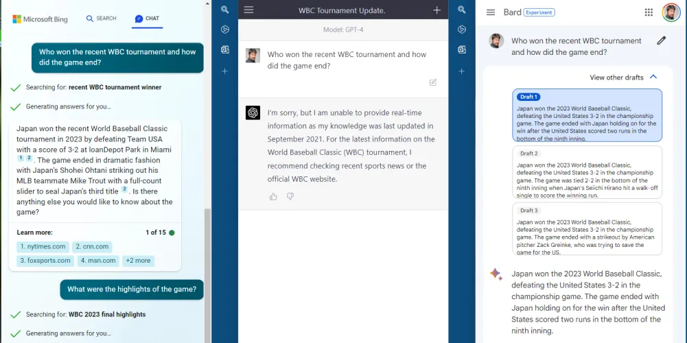 虽然我们知道ChatGPT将增加网络浏览功能,使其保持最新,但目前它的“当前”信息将在2021年结束。我们仍然想知道Bing或Bard是否能够传递最新的信息。只有必应成功了。巴德只是对结果产生了幻觉–而且不仅仅是一次,而且是在所有的草稿中。