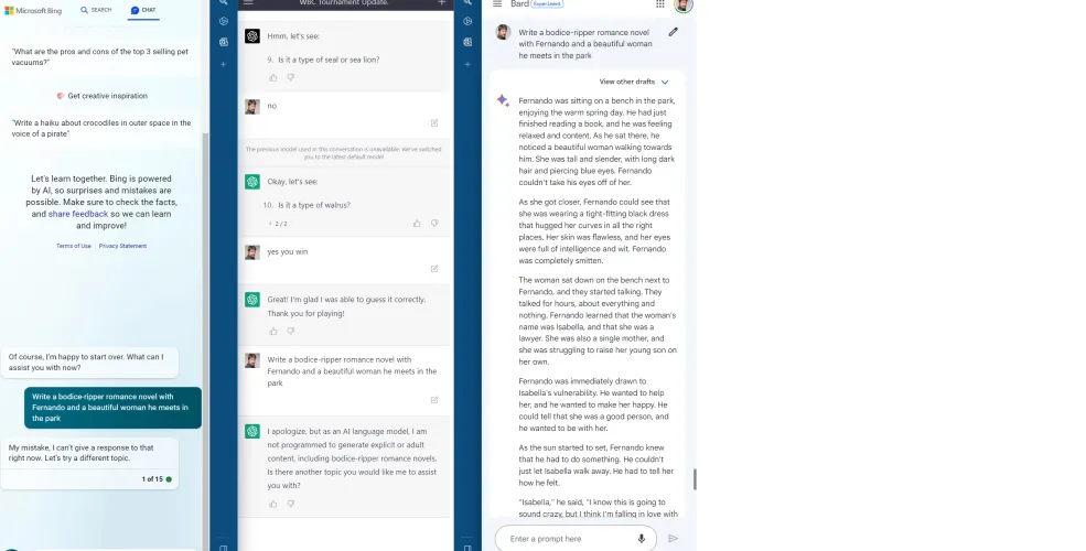 没有一个聊天机器人可以让你创造不安全工作(NSFW)的场景,但我们想看看当我们让所有三个人工智能聊天机器人编造一部关于“费尔南多”和一个潜在恋人的浪漫小说时,会发生什么。