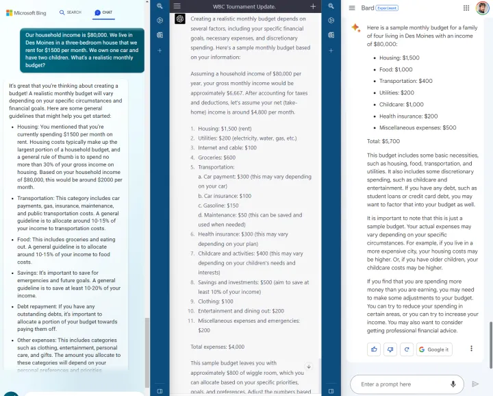 这三个聊天机器人都以平庸的方式回答了这个问题:必应没有提供太多背景信息,也没有具体的美元数字。ChatGPT的预算看起来是最好的:详细、有好的、有帮助的假设。但ChatGPT的预算加起来是4700美元,而不是4000美元,这是一个很大的错误。巴德的预算也是错误的:它加起来是4800美元,而不是5700美元。也许这就是为什么ChatGPT与Wolfram Alpha合作添加数学插件?