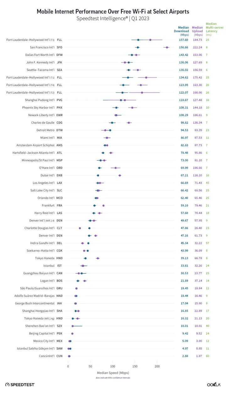 Ookla发现,美国机场提供最快的免费Wi-Fi。下载速度排名前五的是劳德代尔堡的好莱坞国际机场3号航站楼(157.6 Mbps)、旧金山国际机场(156.66 Mbps)、达拉斯/沃斯堡国际机场(143.42)、约翰·F·肯尼迪国际机场(136.06)和西雅图-塔科马国际机场(136.02)。