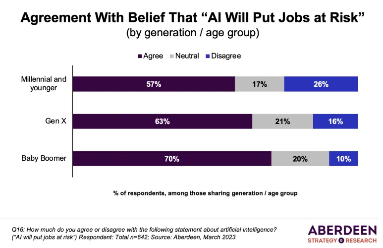人工智能有一个负面的方面,所有年龄段的专业人士都同意:总的来说,所有年龄段的大多数成员(64%)都担心人工智能的发展导致失业。与此同时,千禧一代和年轻一代的担忧(57%)略低于婴儿潮一代(70%)或X世代(63%),尽管更多的受访者担心自己的工作。