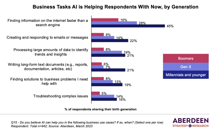 许多千禧一代和更年轻的受访者表示,他们已经在各种使用案例中使用ChatGPT等工具:例如,帮助他们比搜索引擎更快地查找信息(45%)、回复电子邮件(22%)、编写长篇文本文档(21%),以及找到业务问题的解决方案(19%)。