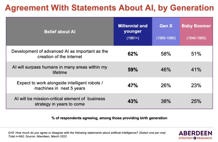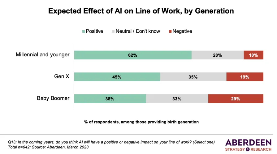 在千禧一代及以下(1981年或以后出生)的受访者中,62%的人认为人工智能将对他们的工作产生积极影响–这一数字明显高于X世代(45%)和婴儿潮一代(38%)。
