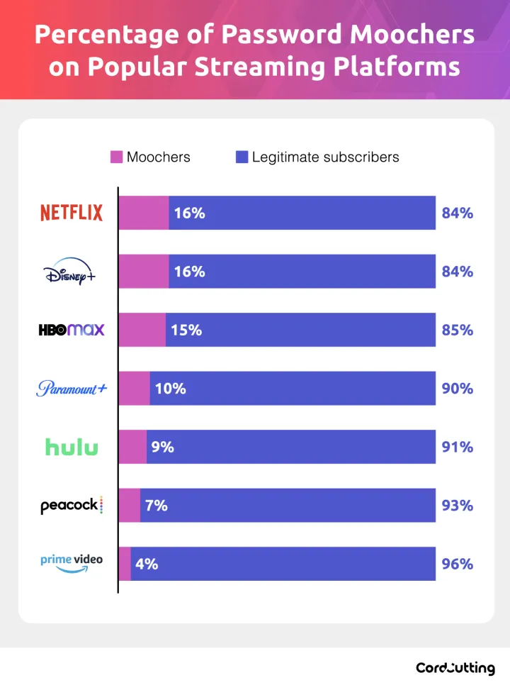 当然,民调总是很有趣。今年,CordCutting(在一个新窗口中打开)对927名使用流媒体服务的人进行了一项调查,以了解有多少人登录到另一个人的一个或多个账户中,发现Netflix的这一数字为16%。迪士尼+也是如此。其他流媒体服务的这一比例更低。