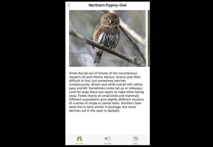 在那次带导游的漫步之前,我曾使用康奈尔大学的一个鸟类网站来查找信息,但我不知道这款移动应用程序以及它能做的一切。不过,我的导游做到了。我们看到这么多物种的原因之一是他用这款应用程序调出了北方侏儒猫头鹰的信息卡片。然后,他打开蓝牙扬声器,播放着侏儒猫头鹰的叫声。他说,该地区的许多鸟类都喜欢捕猎这种小猫头鹰,所以它们会在树上扑来扑去,获得一个很好的有利位置来试图找到它,这样我们人类就更容易发现它们。