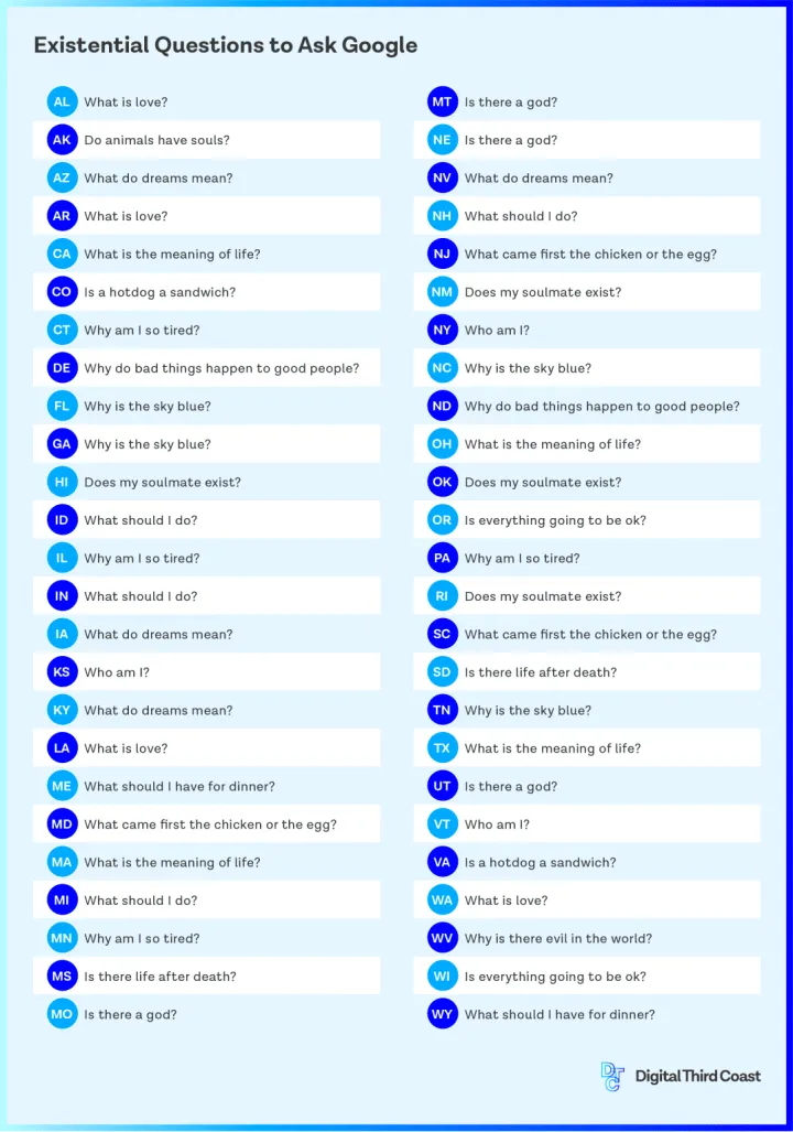 但很多人会问谷歌一些可能没有真正答案的问题。数字第三海岸研究了8647个搜索词,这些搜索词对谷歌进行了测试,并将它们细分出来,显示了美国各州最重要的存在主义查询。