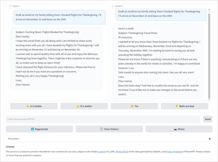 我们尝试了聊天机器人竞技场,如下所示。由于不知道页面为我们选择了哪两个人工智能模型进行比较,我们要求两人都“起草一封电子邮件给我的家人,告诉他们我已经预订了感恩节的机票,11月22日到达,11月30日离开。”每个人都生成了一封建议的电子邮件。我们选择了模型B作为首选选项。