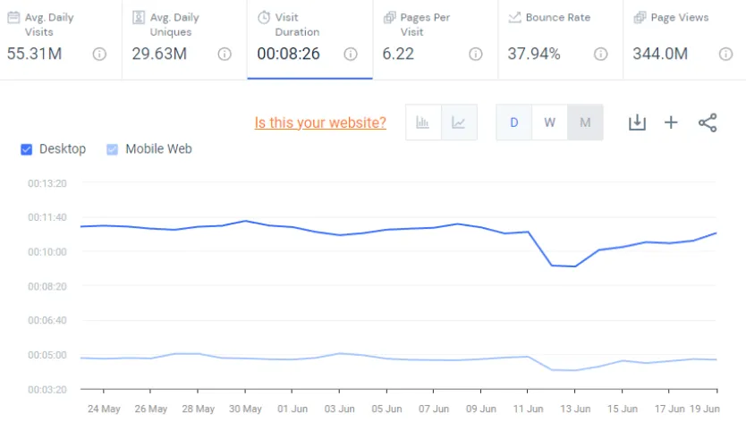 SimilarWeb还提供了一份电子表格,显示Reddit的用户访问量在6月18日和19日达到5,600万次,高于6月13日,也就是抗议活动第二天的5,200万次。此外,在Reddit上花费的平均时间现在超过8分钟,比抗议活动第一天的7分17秒有所增加。