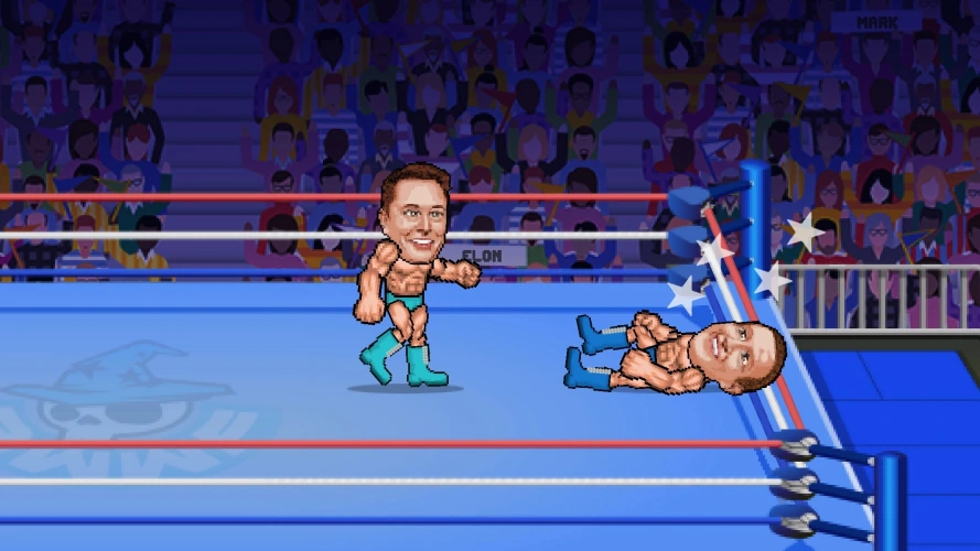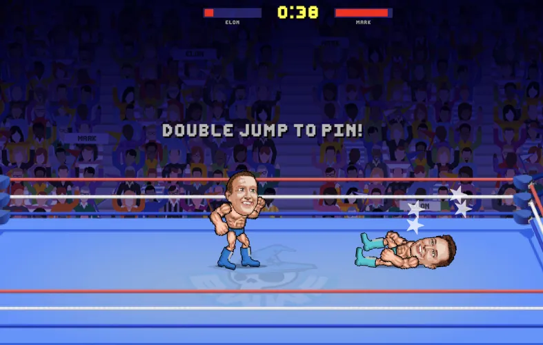 这款游戏有两种玩家模式,非常简单。使用方向键或空格键来猛击、身体猛击或肘击你的对手(无论是马斯克还是扎克伯格)。一旦他们的生命线降到零,你就把他们钉在地上,赢得比赛。