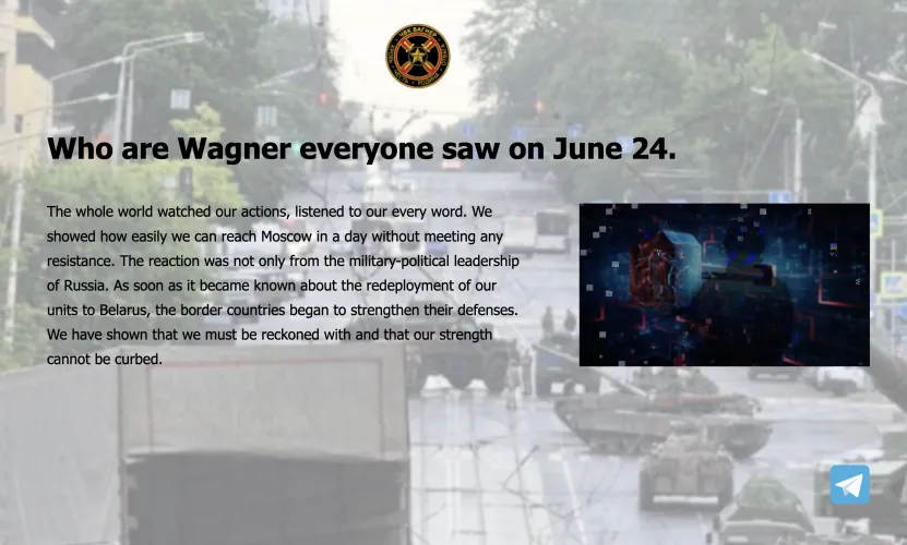 该组织表示,他们还污损了四个俄罗斯网站,并发布了一条标题为:“瓦格纳夫妇是谁?6月24日每个人都看到了他们”的信息。