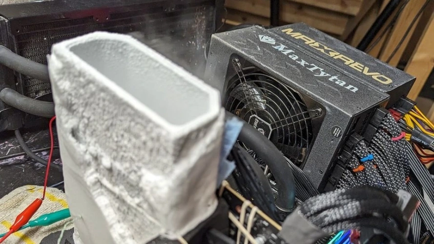 为了达到4 GHz的时钟速度,Goliberso决定进一步使用液氮–在零下192摄氏度–来冷却图形处理器。液氮被放置在供应商Kingpin提供的冷却罐中,可以安装在显卡上。