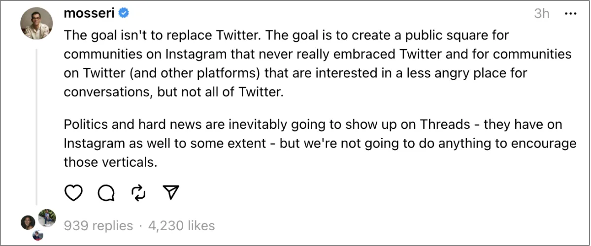 莫塞里补充说,Thads希望创建一个公共广场-这与马斯克收购Twitter的目标相同。不同之处在于,Thads试图成为“一个不那么愤怒的谈话场所”,以努力吸引那些从未接受Twitter的用户。