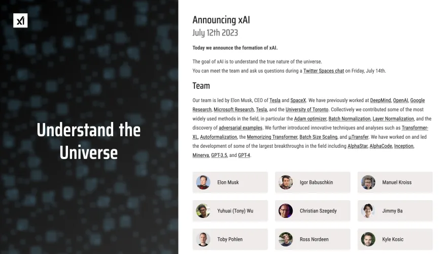 关于总部位于旧金山的Xai的细节仍然很少。目前,其网站上只列出了马斯克和其他10人的工作人员。报告指出:“我们之前曾在DeepMind、OpenAI、谷歌研究院、微软研究院、特斯拉和多伦多大学工作过。”