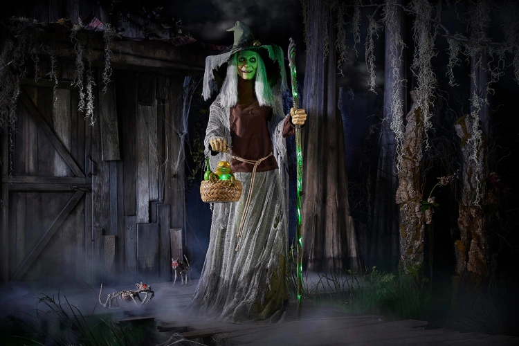 据家得宝的高管称,新的死水系列还包括价值249美元的动画致命女巫莉莉道具,它高达7英尺,提供“主题公园级别的动画电子产品”。这是该零售商万圣节产品阵容中技术最先进的产品之一,配备了八个伺服电机,具有可怕的逼真外观,包括眨眼,环顾四周的眼球,以及当巫婆谈论可怕的灵魂时会移动的嘴巴。LED照亮了它的眼睛、脸、拐杖和它装在篮子里的发光的蟾蜍。对于一个诡异的焦点,你可以选择将女巫与一个99美元5.5英尺的冒泡大锅配对。