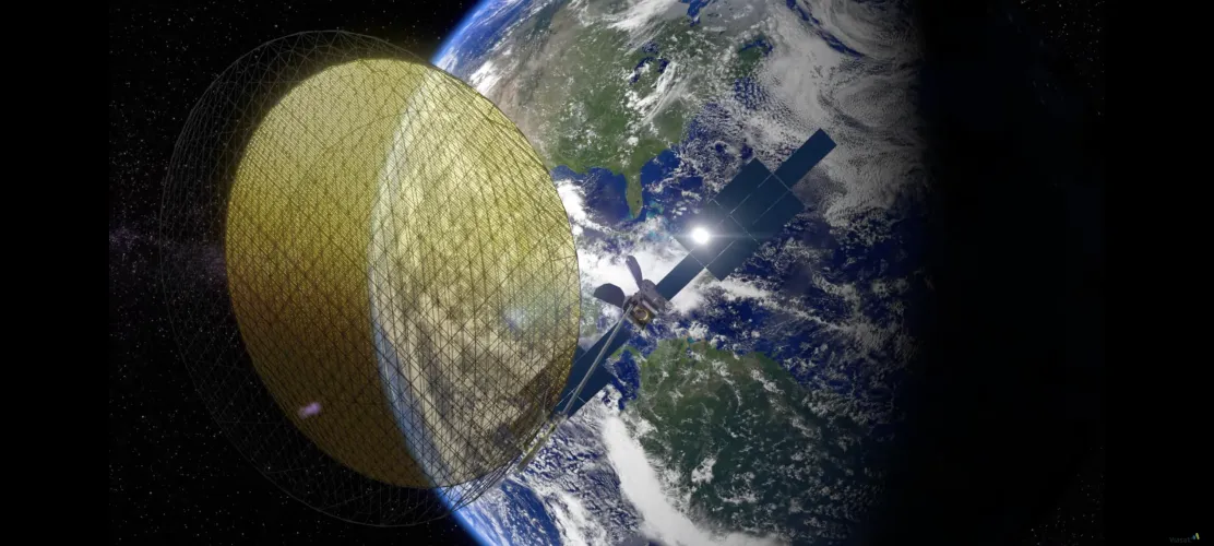 这个巨大的黄色圆圈反射器对卫星的性能至关重要;这个反射器是有史以来送入太空的最大反射器之一,旨在提高卫星的宽带容量。Viasat高级项目经理兼首席执行官Peter Lauenstein在9月份表示:“这使得Viasat能够重复利用更多的容量,因为我们可以同时下行至这么多地点。”
