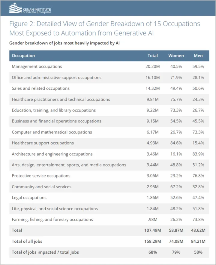 虽然劳动力中的女性总体较少(7400万比8400万),但女性在自动化方面扮演的角色更多(5887万比4862万)。研究发现,这意味着“近80%的职场女性从事的是通过产生式人工智能实现自动化的职业,而男性只有58%。”