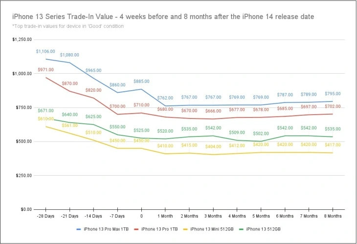 和8月19日至9月1日之间。2022年16日,iPhone13 Pro Max 1TB的折价价值从1106.00美元降至885美元,相差221美元。