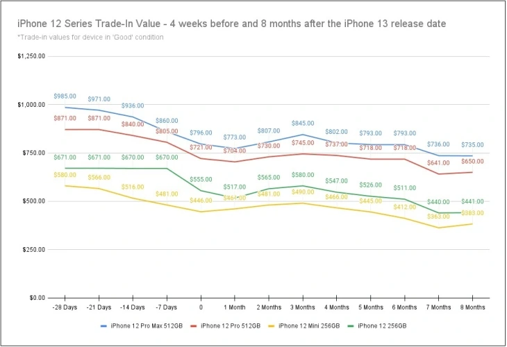 一旦你在新款iPhone发布前四周上市,你的iPhone价值可能会下跌高达261美元。2021年,8月26日至9月。23日,iPhone12 Pro Max 512 GB的折价价格从985美元降至796美元。