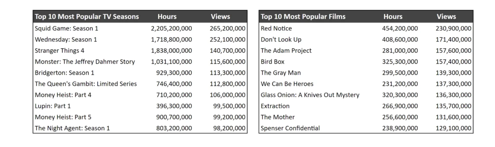 在同一份收益报告中,Netflix还披露了该平台有史以来收视率最高的电视剧和电影,包括它们的浏览量。《鱿鱼游戏》在电视节目排行榜上名列前茅,而《红色通告》则吸引了最多的电影观众。