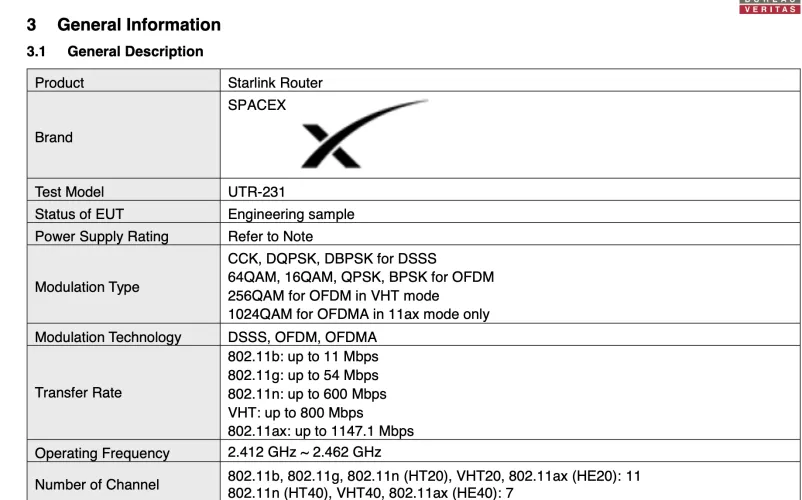 SpaceX提交了申请,以证明该路由器是根据FCC无线电规则运行的。为此,该公司提交了两份设备测试报告。其中一张显示,该路由器在2.4 GHz的频率下,通过Wi-Fi 6可以达到1147.1 Mbps的速度;另一张显示,在5 GHz的频段上,最高速度可以达到2401.9 Mbps。