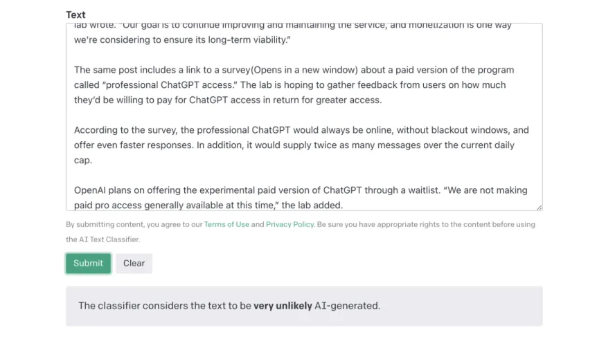 AI检测工具可能是一个开始,尽管OpenAI的工具从一开始就有限且不准确。它需要有人手动输入一段至少1000个字符的文本,然后OpenAI会认为这是人工智能或人类。它只成功地将26%的人工智能书写的文本归类为“可能的人工智能书写的”,并在9%的时间内错误地将人类书写的文本标记为人工智能。