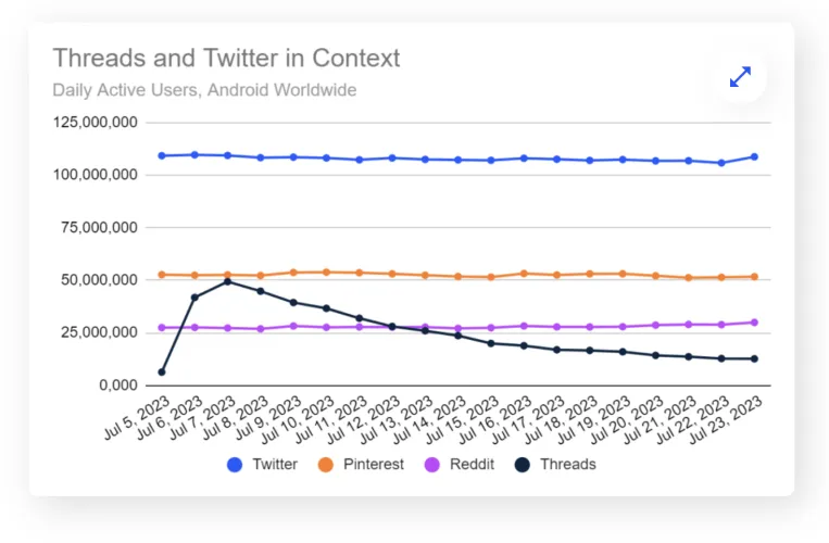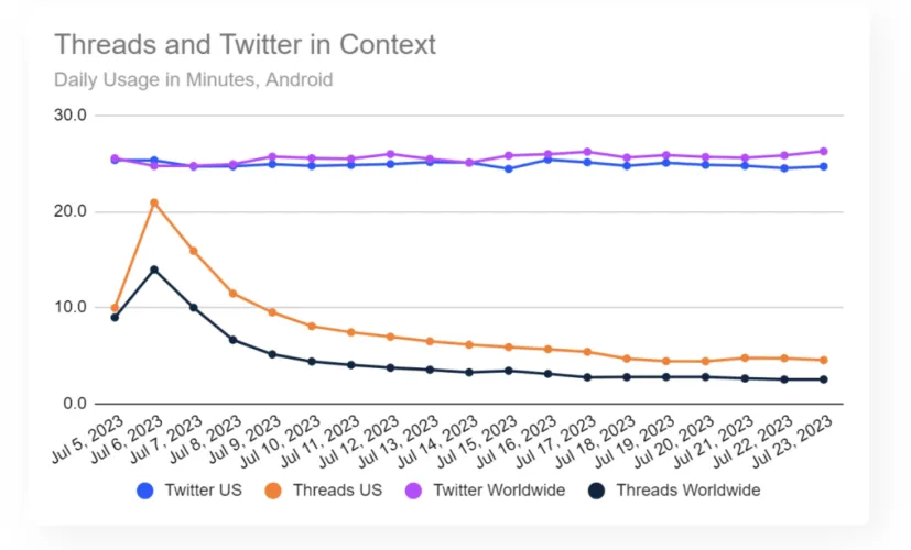 在推出后,注册人数激增,人们对Meta的Twitter竞争对手Thads的兴趣继续下降。