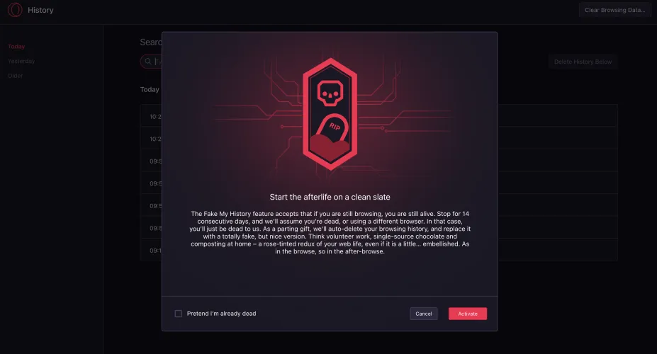 我们将不得不等待,看看它是如何运作的。这看起来并不像是假的我的历史已经推出到歌剧院GX。但该公司表示,这一功能将是可以选择加入的。用户还可以选择“假装我已经死了”的设置,该功能将立即生效,用更华丽的结果取代你当前的互联网历史记录。