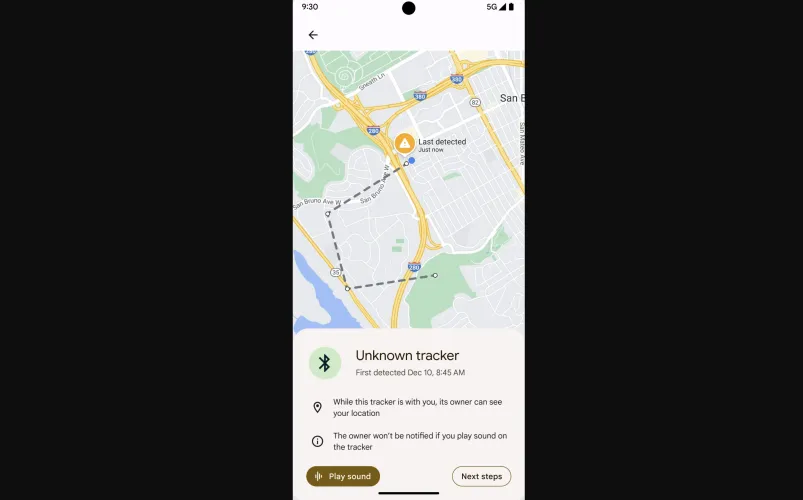 该公司表示:“你可以点击通知,了解更多关于追踪器的信息,并查看追踪器与你同行的地图。”“你也可以点击‘播放声音’,追踪器就会发出声响,帮助你在追踪器主人不知道的情况下找到它。”