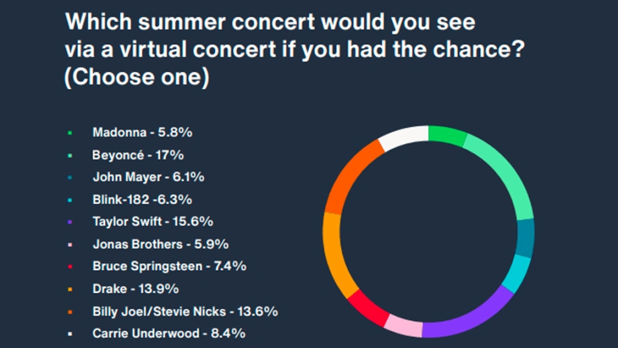 如果有机会在网上观看演唱会,17%的受访者会选择碧昂斯,15.6%的泰勒·斯威夫特,13.9%的德雷克,13.6%的比利·乔尔/史蒂维·尼克斯,8.4%的凯莉·安德伍德,7.4%的布鲁斯·斯普林斯汀,6.4%的Blink-182,5.9%的乔纳斯兄弟和5.8%的麦当娜。