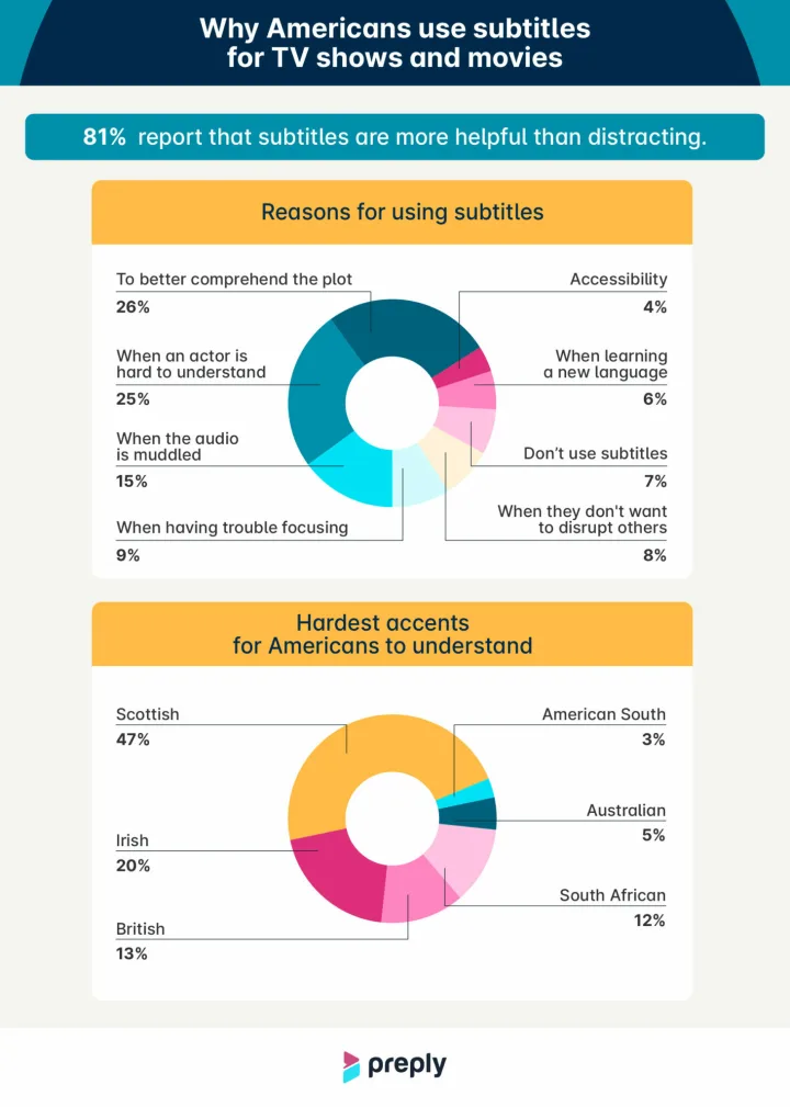 你要么是字幕爱好者,要么不是。但越来越多的人这样做了。Preply对2022年以来的美国人字幕使用情况进行了调查,发现使用字幕的人数比过去增加了5%,达到58%。