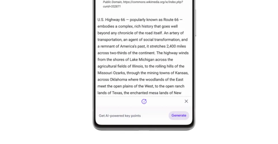 该功能也是专门为长格式内容设计的。当你用Chrome在移动设备上滚动页面时,会出现一个名为“Get AI-Powed Key Points”的选项。点击它将导致Chrome将网页内容分解为一系列关键点。