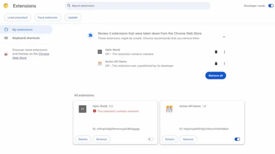 随着Chrome117的发布,Chrome设置中的“隐私和安全”部分将列出所有需要审查的已安装扩展。如果用户点击“查看”按钮,他们将被告知哪些扩展已经从商店中消失了,以及为什么,并允许他们选择删除它们或隐藏警告并继续使用它们。