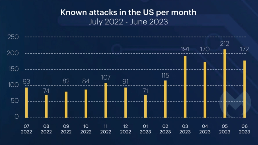最后一点:虽然一些勒索软件组织似乎因乌克兰战争而处于变动状态,但Malware Bytes最近的一份报告显示,过去一年的攻击有所增加,美国在全球攻击中首当其冲(43%)。黑客越来越多地将目标对准医院和学校等公共服务部门。