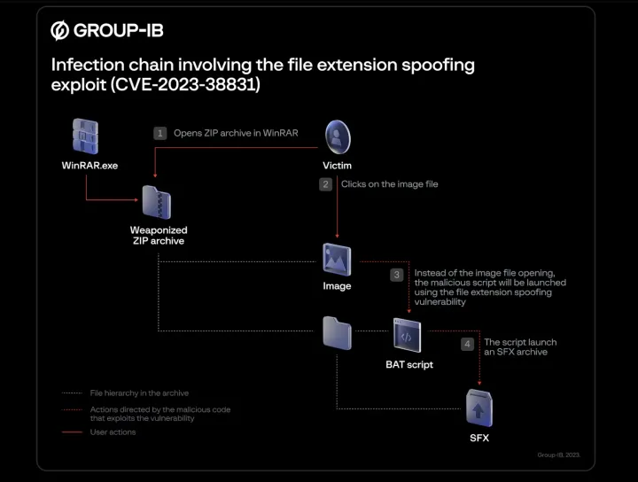 组IB发现的漏洞已被指定为CVE-2023-38831。通过滥用该漏洞,黑客可以对归档文件中的文件扩展名进行“欺骗”,从而很容易将恶意程序隐藏在.jpg或.txt等良性文件格式下。